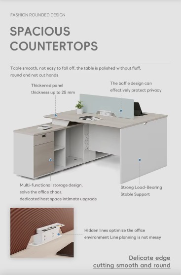 This modern workstation accommodates custom configurations and exhibits streamlined aesthetics, tailored for a quadruplicate employee station. Outfitted with dividers, it furnishes discretion and cooperative areas, rendering it apt for vibrant corporate milieus.
